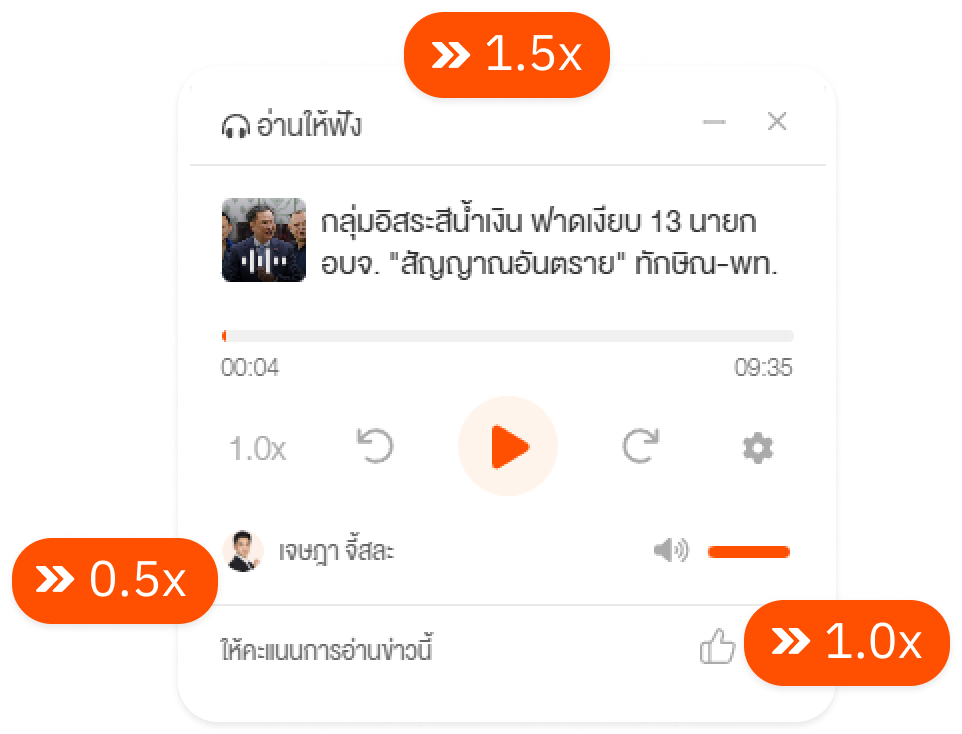 เพิ่มหรือลด ความเร็วการอ่านของบอตมีให้เลือกตั้งแต่ความเร็ว 0.5, 1, 1.5 และไม่พลาดทุกข้อความสำคัญ สามารถย้อนหรือข้ามข้อความได้ 10 วินาที